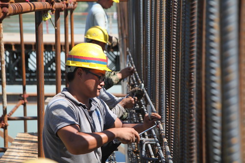 白龙江大桥施工人员在烈日下绑扎桥墩钢筋